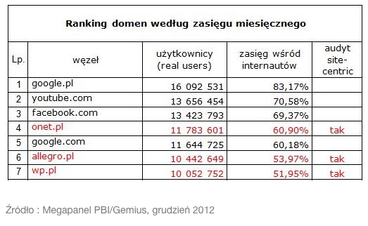 W czołówce rankingu domen według zasięgu miesięcznego nadal bez zmian.Pierwsze trzy miejsca zajmują: google.pl, youtube.com oraz facebook.com.